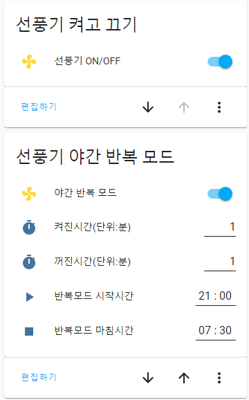 fan_nightmode_start/end는 "시간"으로 설정하였습니다.