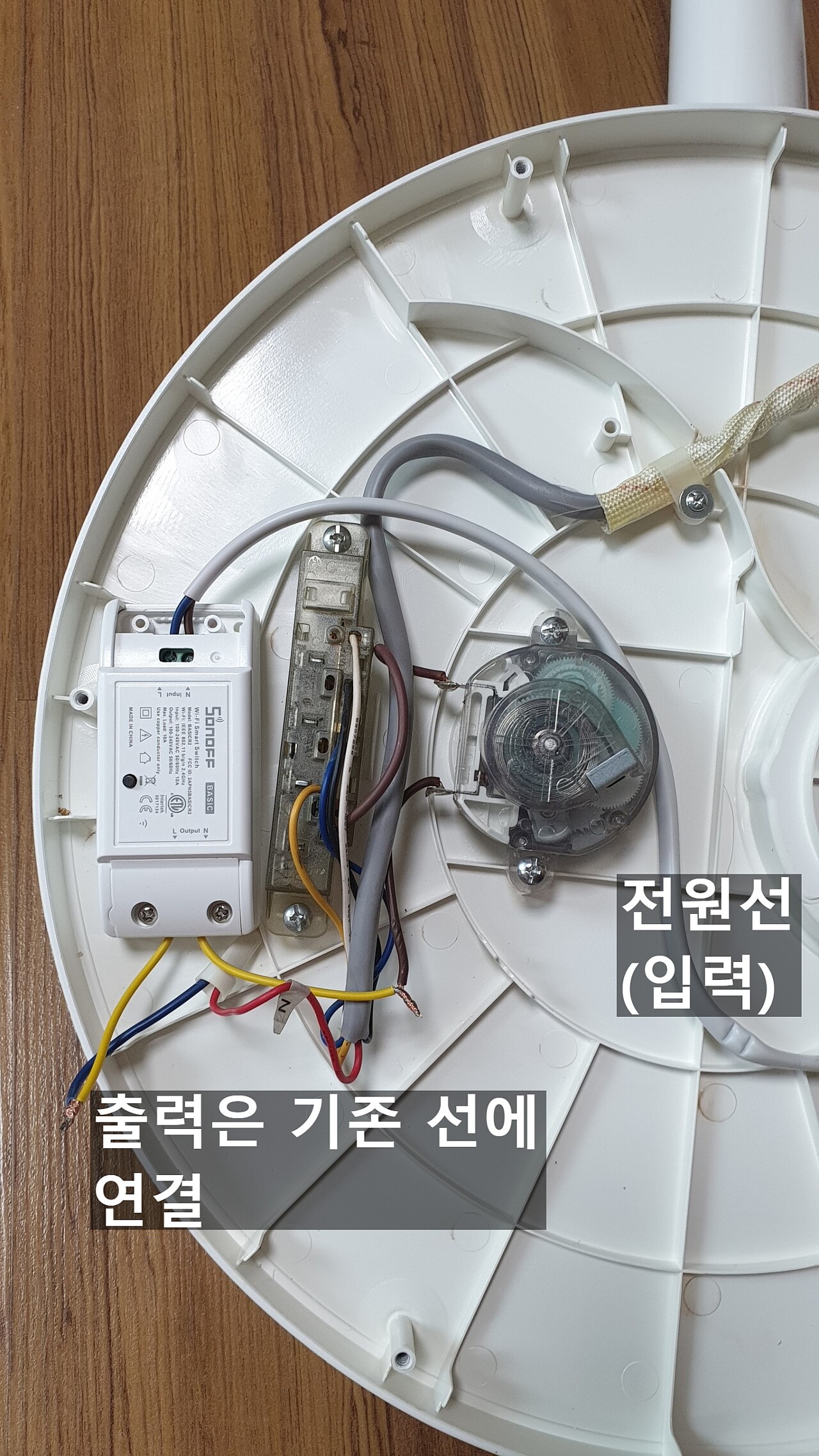 그 선풍기를 뜯어서, 아래와 같이 sonoff basic을 달아 주었습니다.