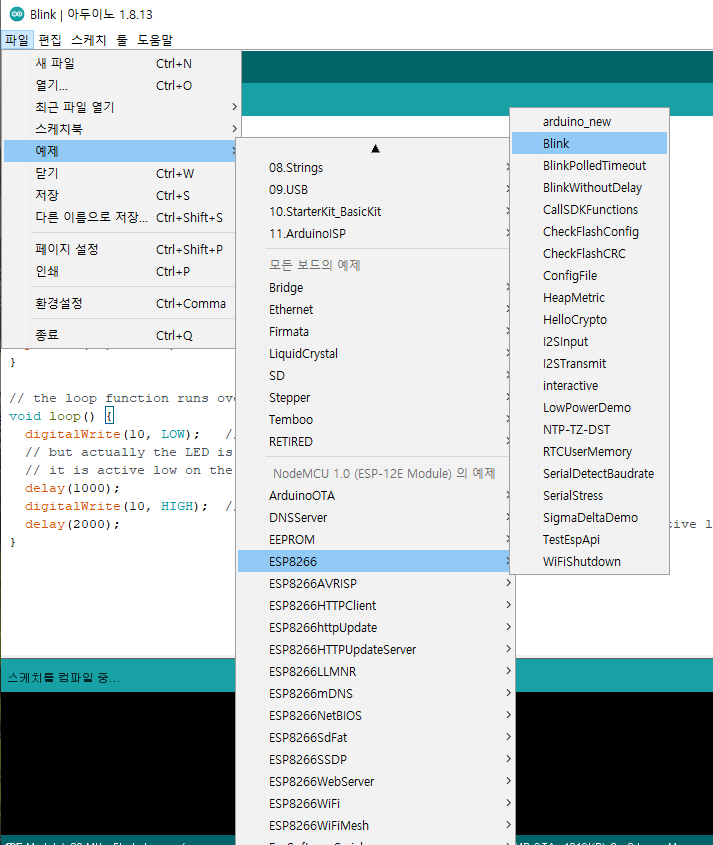 예제 - ESP8266 - Blink 를 열면 별 것 없이 기본 소스코드가 나올 것이다. 아두이노가 좋은 점은 이렇게 기본 예제들을 제공해 준 다는 것이다. 다른 예제들도 시간이 되면 다루어 볼 것이다. 시간이 되면...