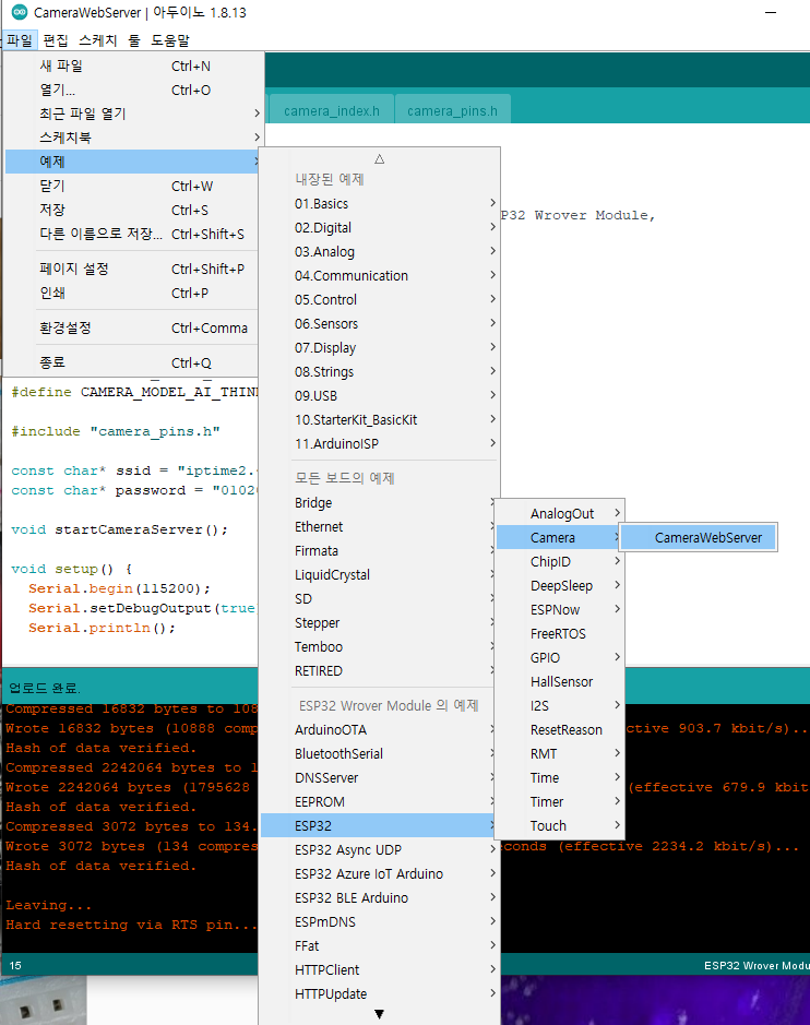 이제 아두이노에서 ESP32-cam의 보드 선택을 마쳤다.